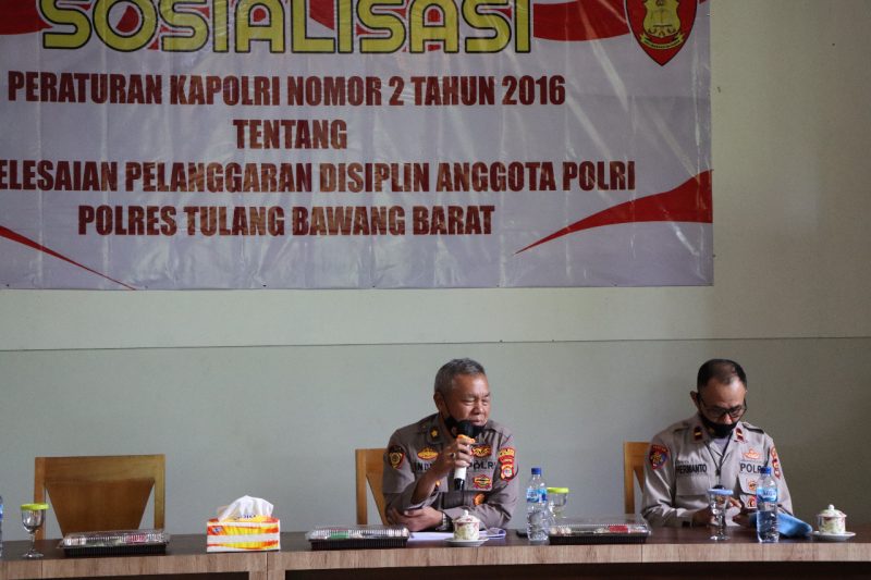 Polres Tulang Bawang Barat Gelar Sosialisasi Peraturan Kapolri (Perkap) Nomor 2 Tahun 2016 tentang penyelesaian pelanggaran disiplin anggota Polri di Gedung Wisma Asri Tiyuh Tirta Kencana Kec Tuba Tengah , Rabu 24/11/2021.