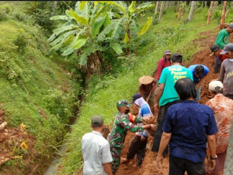Hal tersebut terbukti saat Babinsa Desa Gunungsari Serma Suradi, dengan sepenuh hati membantu warga masyarakat melaksanakan kerja bakti mengeruk tanah/talut longsor, yang menimbun aliran irigasi yang mengaliri sawah warga Gunungsari kurang lebih 10 hektar, Sabtu(27/11/2021).