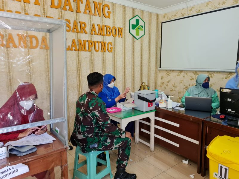 Guna tercapainya Herd Imunity serbuan vaksinasi covid – 19 terus di gencarkan oleh satuan jajaran Kodim 0410/KBL yang mana kali ini Koramil 410-02/Teluk Betung selatan berkolaborasi dengan Puskesmas Pasar Ambon melaksanakan serbuan vaksinasi di Aula Puskesmas Pasar Ambon Kecamatan Teluk Betung Selatan Kota Bandar Lampung. Rabu (08/12/2021)