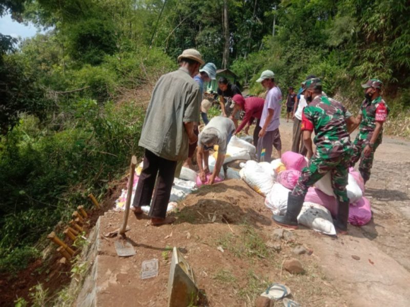 Guna mengantisipasi terjadinya longsor di musim penghujan, datang Babinsa Kelurahan Karang, Koramil 22/Slogohimo, Serda Budi Surepno bersama masyarakat saling bergotong-royong dan saling bahu-membahu memperbaiki tanggul jalan desa.