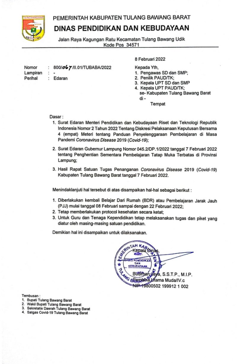 Dinas Pendidikan dan Kebudayaan (Disdikbud) Kabupaten Tulang Bawang Barat (TUBABA), akan memberlakukan sistem Pembelajaran Secara Daring (Dalam jaringan) yang dijadwalkan di Mulai pada Tanggal 8 hingga 22 Februari 2022.