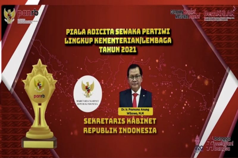 Sekretaris Kabinet (Seskab) Pramono Anung meraih Piala Adicita Sewaka Pertiwi. Penghargaan tersebut diserahkan oleh Menteri Pendayagunaan Aparatur Negara dan Reformasi Birokrasi pada acara “Penyampaian Hasil Evaluasi dan Penghargaan Pelayanan Publik di Lingkup Kementerian, Lembaga, dan Pemerintah Daerah Tahun 2021”, Selasa (08/03/2022), di Hotel Interncontinental Jakarta Pondok Indah.