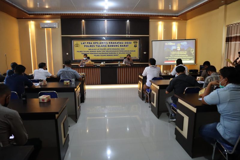 Polres Tulang Bawang Barat Menggelar Latihan Pra Operasi ( Lat Pra Ops ) Antik 2022, Operasi dengan Sandi “ Ops Antik Krakatau 2022″ merupakan Operasi Kepolisian dengan Sasaran jaringan Peredaran Narkotika baik pengedar maupun pengguna, kegiatan Lat Pra Ops, dibuka langsung, Waka Polres Tulang Bawang Barat Kompol Zulkarnain, S.E, S.H, M.H di Aula Mapolres Tulang Bawang Barat, Kamis (17/03/2022) Sekira Pukul 09.30 WIB.