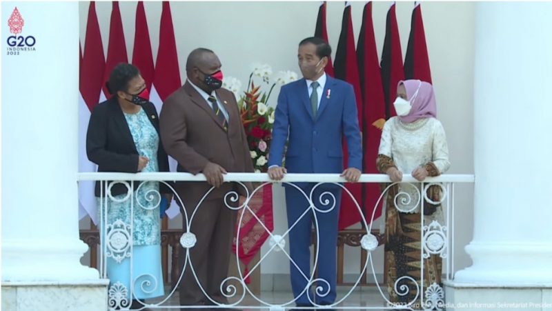 Presiden RI Joko Widodo (Jokowi) didampingi Ibu Negara Iriana Jokowi menerima kunjungan resmi Perdana Menteri (PM) Papua Nugini James Marape beserta Ibu Rachael Marape, di Istana Kepresidenan Bogor, Jawa Barat, Kamis (30/03/2022) pagi.