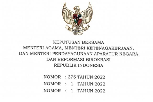 Buanaangkasa.com-Pemerintah telah menyepakati dan menetapkan perubahan hari libur nasional dan cuti bersama tahun 2022. Kesepakatan tersebut tertuang dalam Surat Keputusan Bersama (SKB) Menteri Agama (Menag), Menteri Ketenagakerjaan (Menaker), Menteri Pendayagunaan Aparatur Negara dan Reformasi Birokrasi (Menteri PANRB) Nomor 375 Tahun 2022, Nomor 1 Tahun 2022, Nomor 1 Tahun 2022 tentang Perubahan Atas Keputusan Bersama Menag, Menaker, Menteri PANRB Nomor 963 Tahun 2021, Nomor 3 Tahun 2021, Nomor 4 Tahun 2021 tentang Hari Libur Nasional dan Cuti Bersama Tahun 2022.