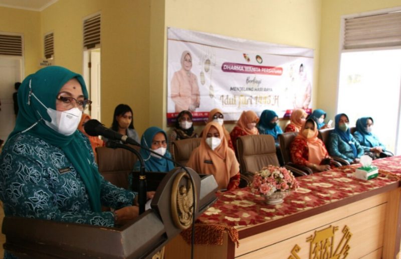 Ketua TP-PKK Kabupaten Lampung Utara (Lampura) Hj. Nur Endah Sulastri Budi Utomo S.Pd.,M.M bersama Ketua Dharma Wanita Persatuan Lampung Utara Hj. Haliana Daita Lekok, SE.,M.M hari ini menggelar kegiatan Bhakti Sosial Pembagian Sembako Menjelang Hari Raya Idul Fitri 1443 H / 2022 M Kepada Para Pramu Kebersihan dan Sopir Opd Pemkab Lampung Utara di Kantor TP-PKK Kabupaten Lampung Utara, Rabu 20 April 2022.