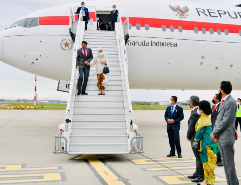 Presiden dan Ibu Iriana disambut Duta Besar Indonesia untuk Kerajaan Belanda Mayerfas dan langsung menuju ruang tunggu. Turut mendampingi Presiden dan Ibu Iriana, Menteri Koordinator Bidang Kemaritiman dan Investasi Luhut Binsar Pandjaitan, Menteri Sekretaris Negara Pratikno, Menteri Perdagangan Muhammad Lutfi, dan Menteri Investasi/Kepala Badan Koordinasi Penanaman Modal (BKPM) Bahlil Lahadalia.