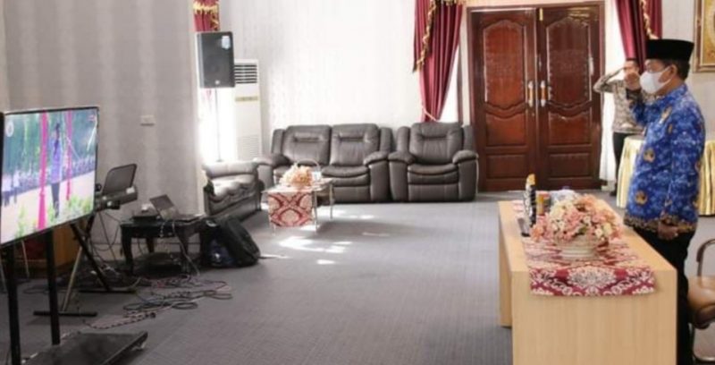 Bupati Lampung Utara (Lampura), H. Budi Utomo mengikuti Upacara Hari Kebangkitan Nasional (Harkitnas) Ke-114 Tahun 2022 secara virtual di rumah dinasnya, Jumat (20/05/2022).