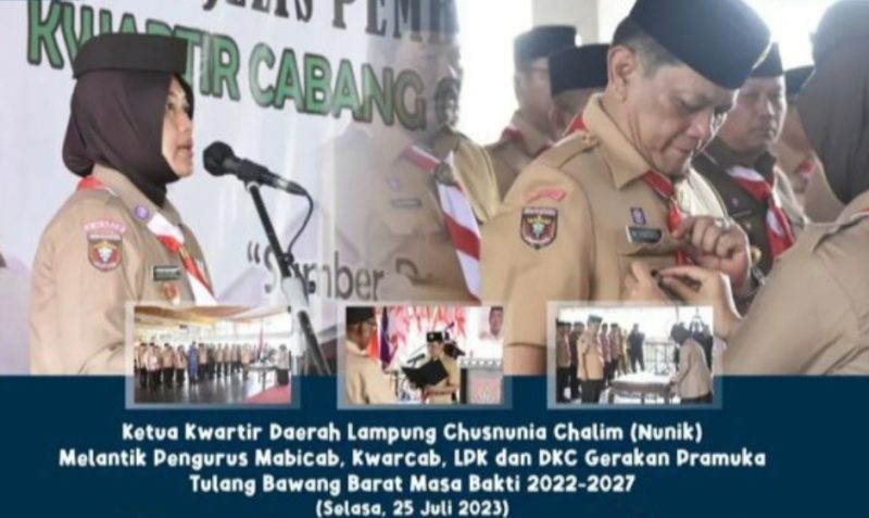 TULANG BAWANG BARAT, Buanaangkasa.com – Ketua Kwartir Daerah (Kwarda) Gerakan Pramuka Lampung, Chusnunia Chalim atau Nunik sapaan akrab, melantik secara resmi pengurus Majelis Pembimbing Cabang (Mabicab) Gerakan Pramuka Kabupaten Tulangbawang Barat (Tubaba) Masa Bakti 2022-2027 dan menjadikan penjabat Bupati Tubaba, Drs. M Firsada, sebagai Kamabicab (Ketua Majelis Pembimbing Cabang), di Sesat Agung Bumi Gayo Kabupaten Tubaba. Selasa (25/07/23).
