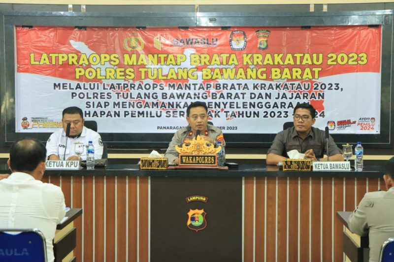 Kegiatan dalam rangka pengamanan tahapan Pemilu serentak Tahun 2023/2024, Polres Tulang Bawang Barat menggelar Latihan Pra Operasi (Latpra Ops) Mantap Brata 2023 yang dilaksanakan di Aula Mapolres Tulang Bawang Barat, Senin 16 Oktober 2023.
