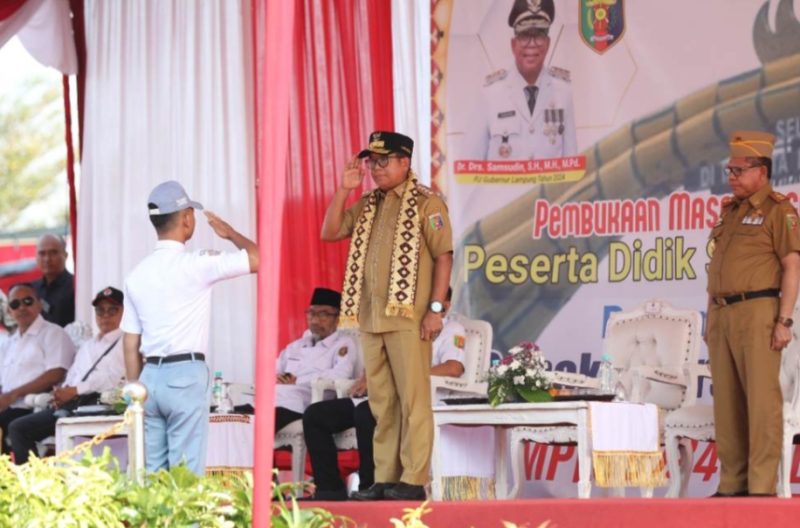 Pj. Gubernur Lampung Samsudin menjadi Pembina Apel Pembukaan Masa Pengenalan Lingkungan Sekolah (MPLS) Peserta Didik Baru SMA/SMK Negeri/Swasta Se-Provinsi Lampung Tahun Ajaran 2024/2025, di Wisata Bendungan Way Sekampung Kabupaten Pringsewu, Senin (15/7/2024).
