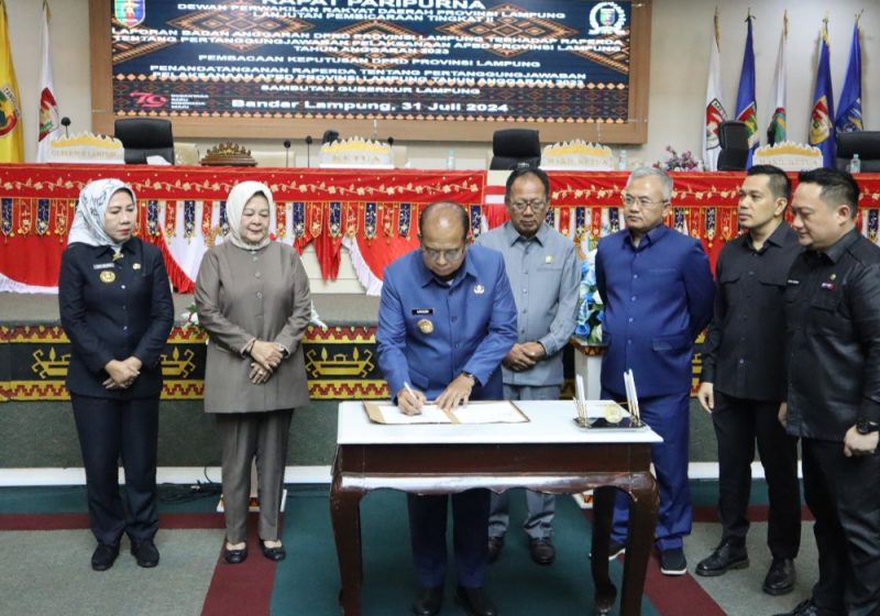 Dalam kesempatan tersebut Penjabat Gubernur Lampung, Samsudin bersama Ketua DPRD Provinsi Lampung Mingrum Gumay melakukan penandatanganan Raperda tentang Pertanggungjawaban Pelaksanaan APBD Provinsi Lampung Tahun Anggaran 2023.