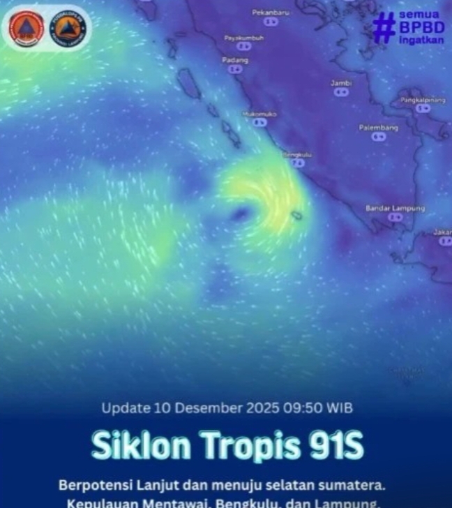 BMKG melaporkan bahwa Kamis (11/12/2025) dalam 24 jam ke depan, bibit siklon tropis 91S diperkirakan bergerak mendekati daratan Sumatera. Selanjutnya pada 36 hingga 72 jam mendatang, sistem ini diprediksi berbelok menuju barat daya dan menjauhi Pulau Sumatera.